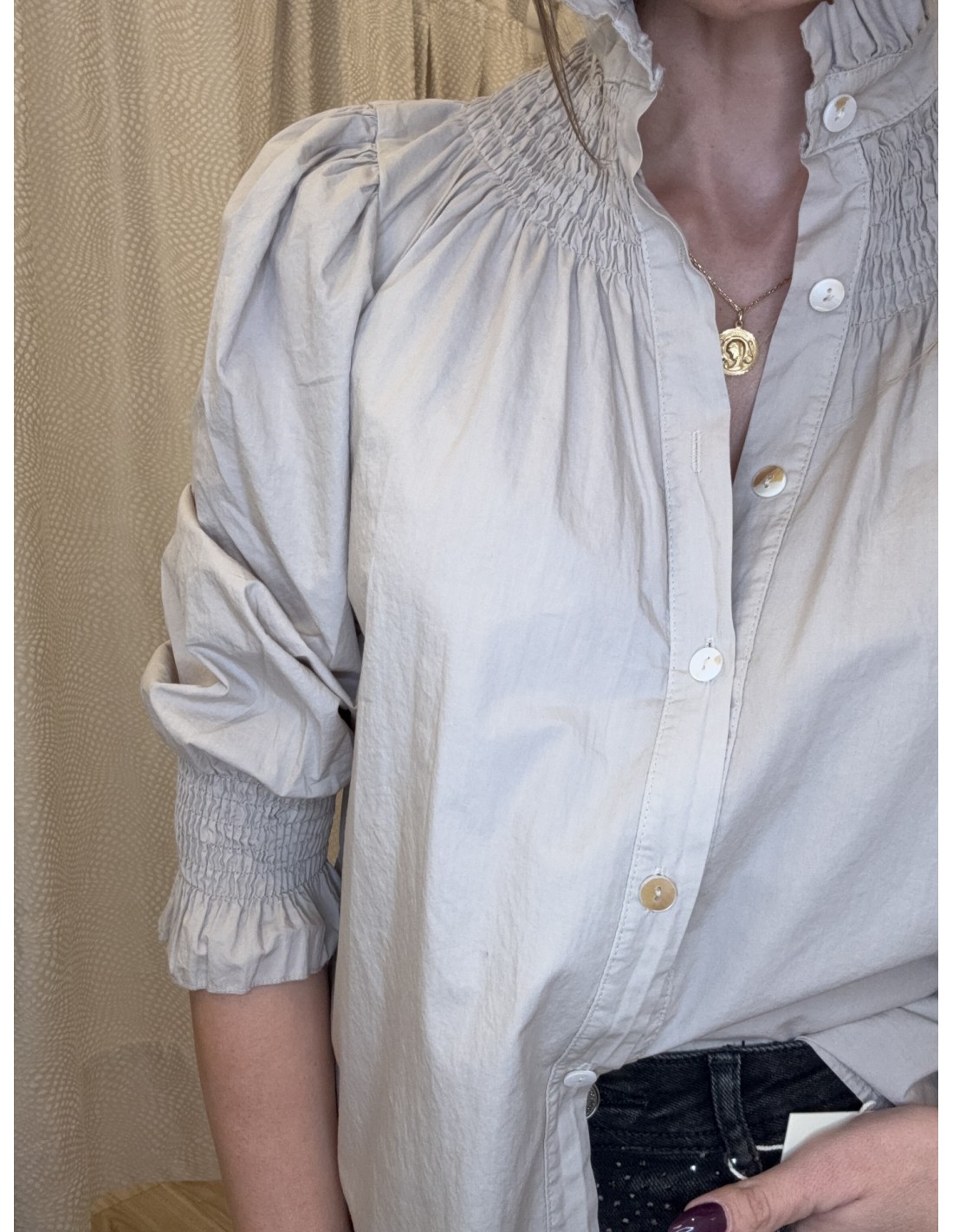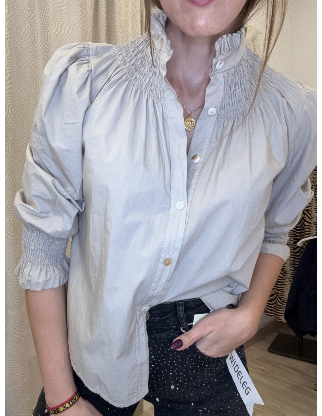 Blusa 100% Algodón con cuello y mangas fruncidas con volante, corte recto. Talla única, abarca desde una 34/36 a una 40/42.