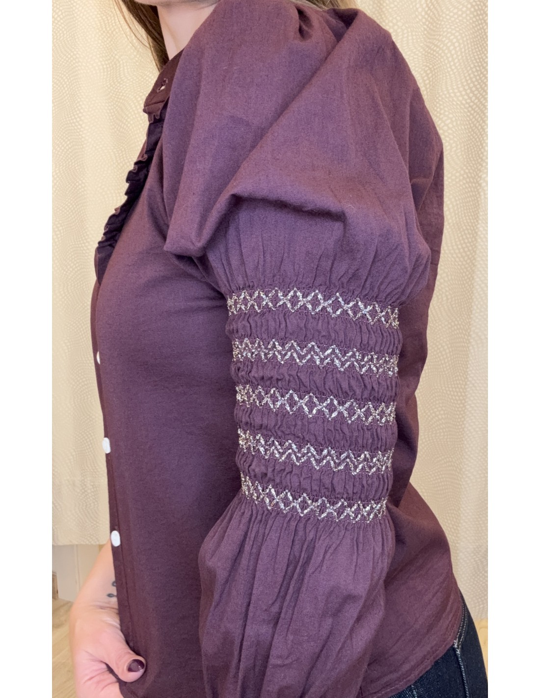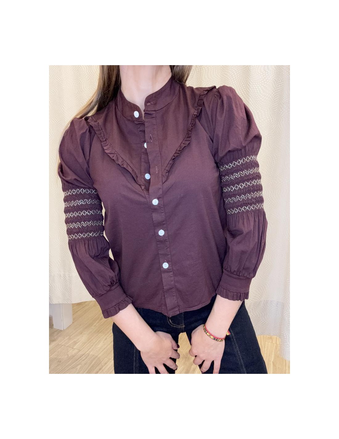 Blusa 100% algodón, con pequeño volante en pechera, cuello mao, manga fruncida con detalle de bordado en hilo de lurex.