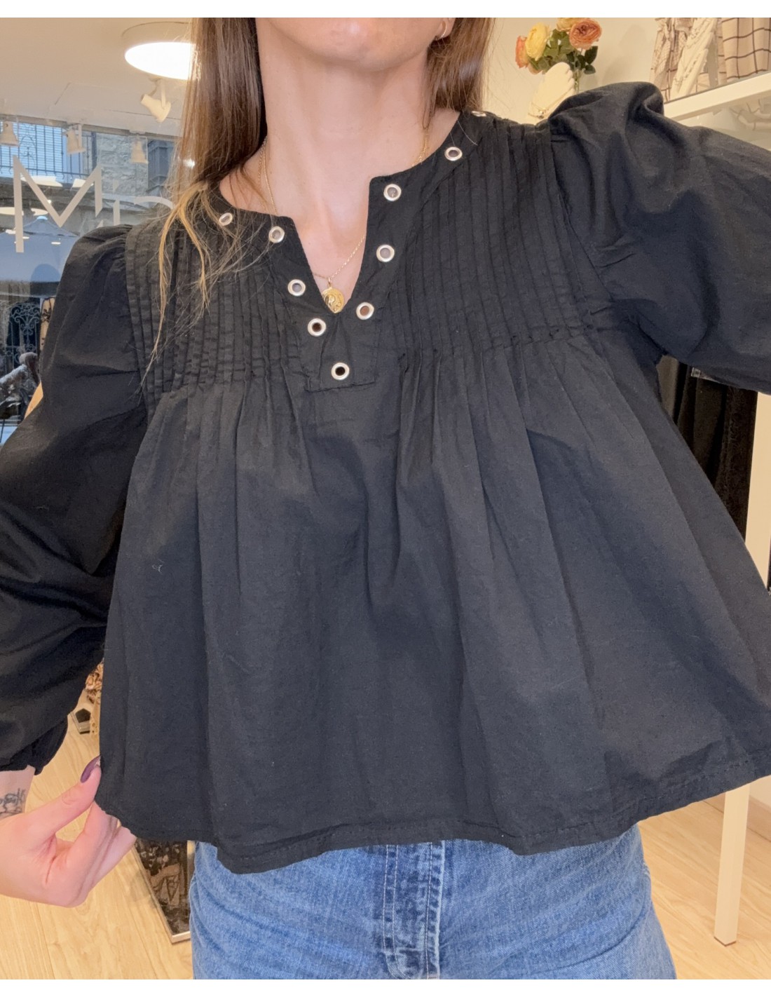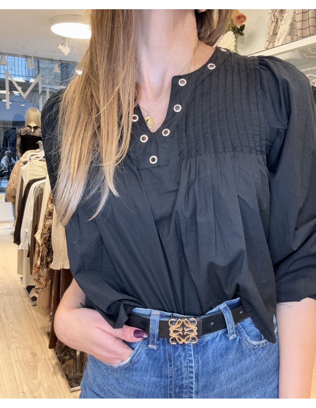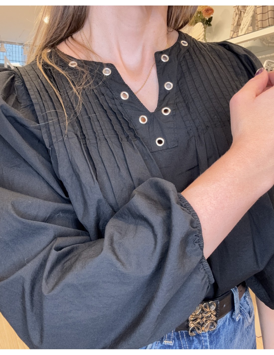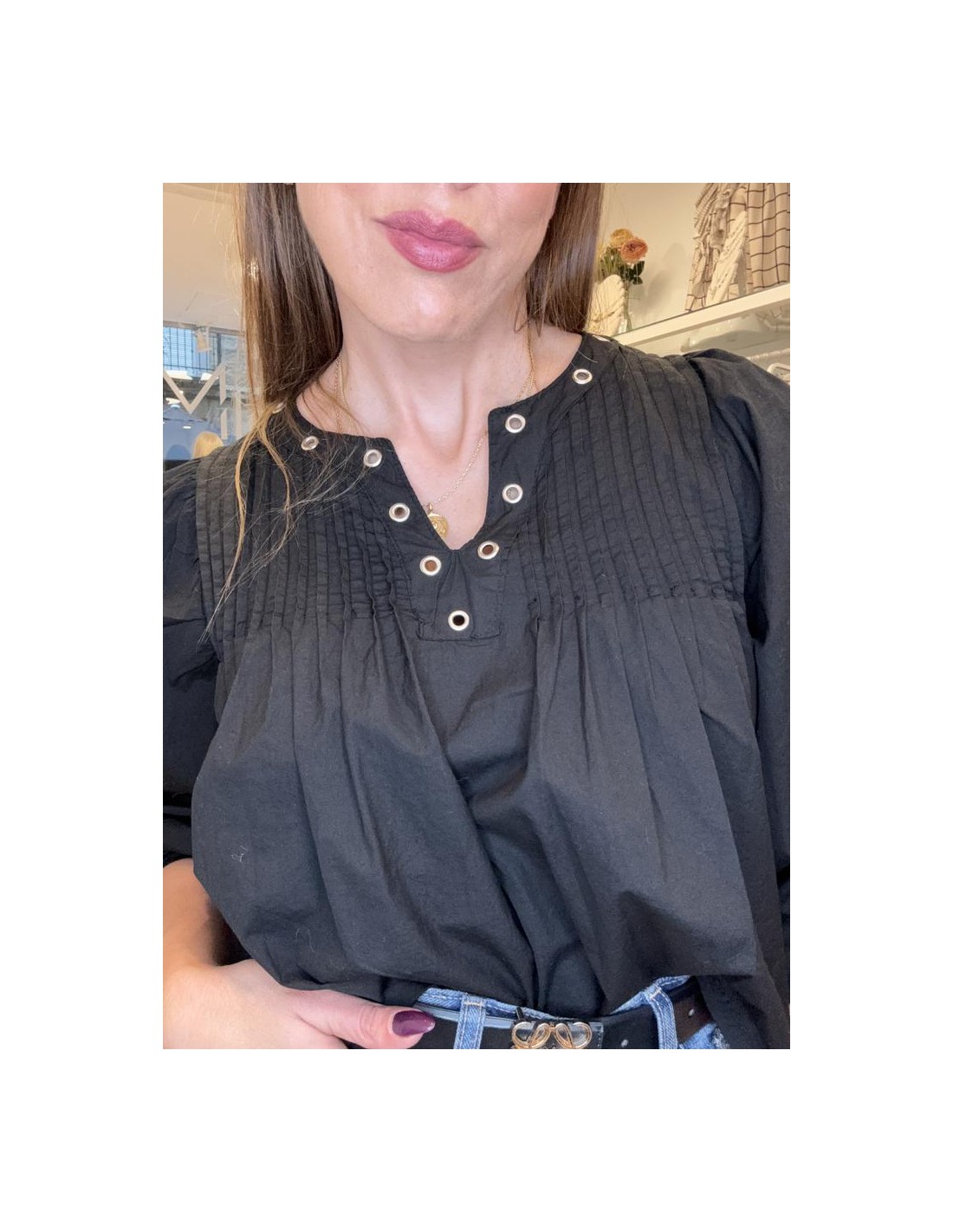 Blusa 100% Algodón corta, con escote pico con detalle de tachas en plata, pechera con presillas. Manga con puño abullonado con elástico.