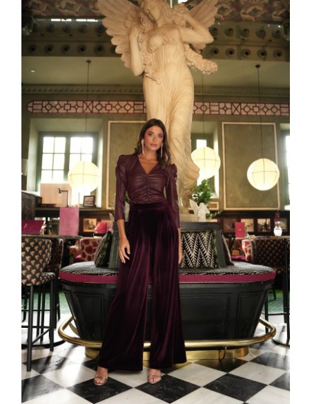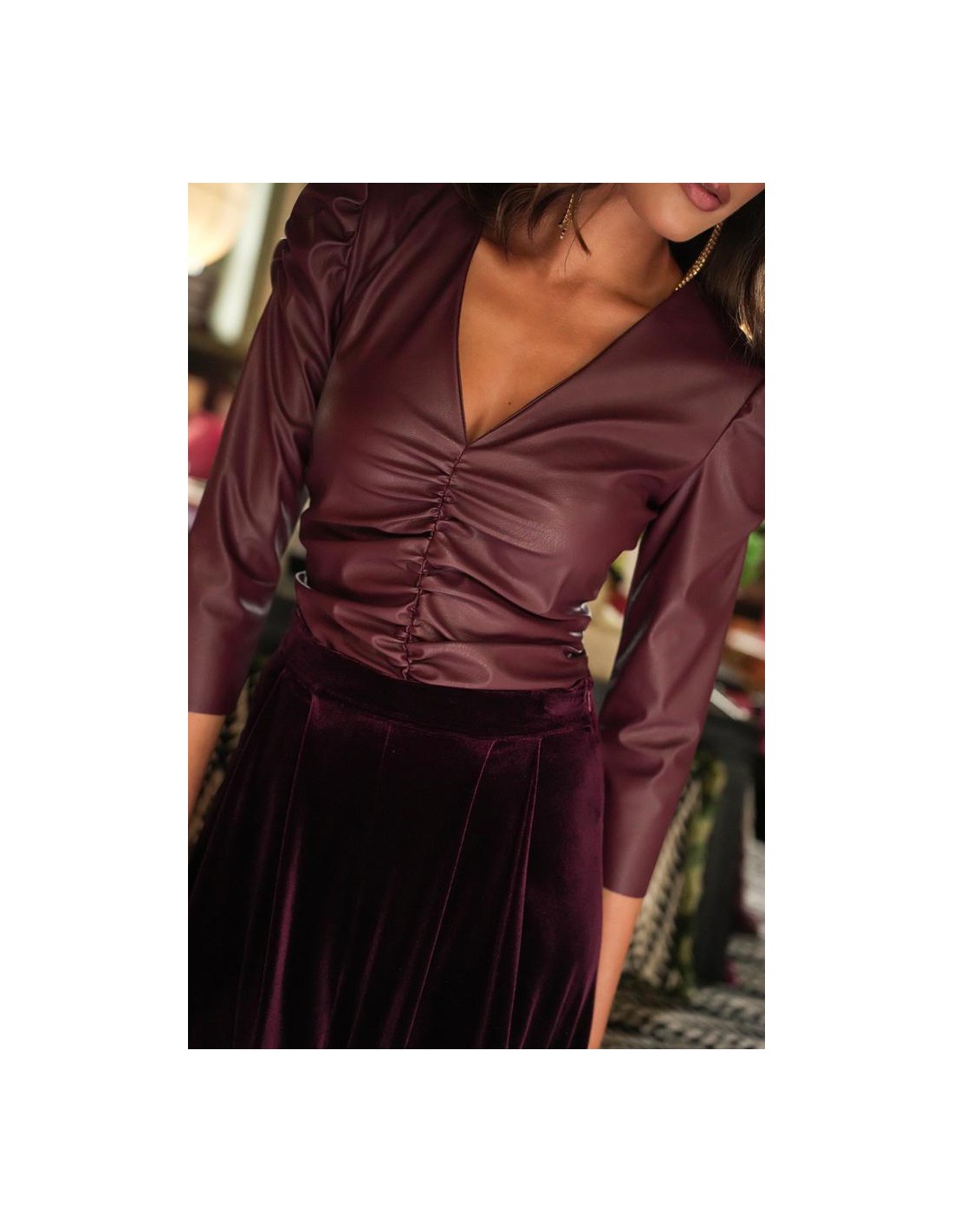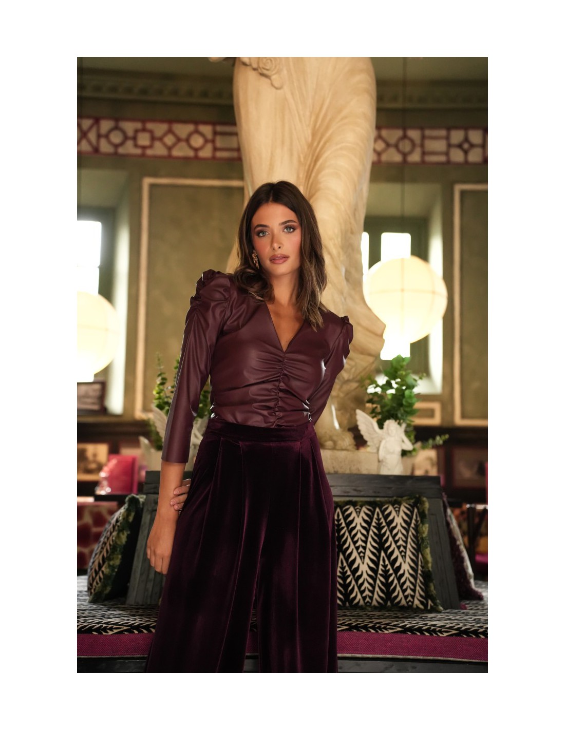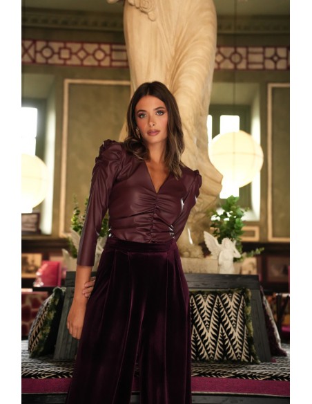 Este top está confeccionado en tejido efecto cuero que aporta carácter y modernidad. El fruncido central en el delantero estiliza la figura y realza el escote en pico. Las mangas ligeramente abullonadas añaden volumen y elegancia, creando un equilibrio perfecto entre fuerza y sutileza. Cierre con cremallera invisible en espalda.