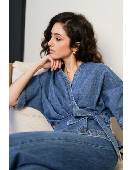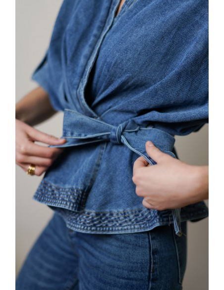 Blusa tejana cruzada, con manga corta y detalle de lazada en cintura.