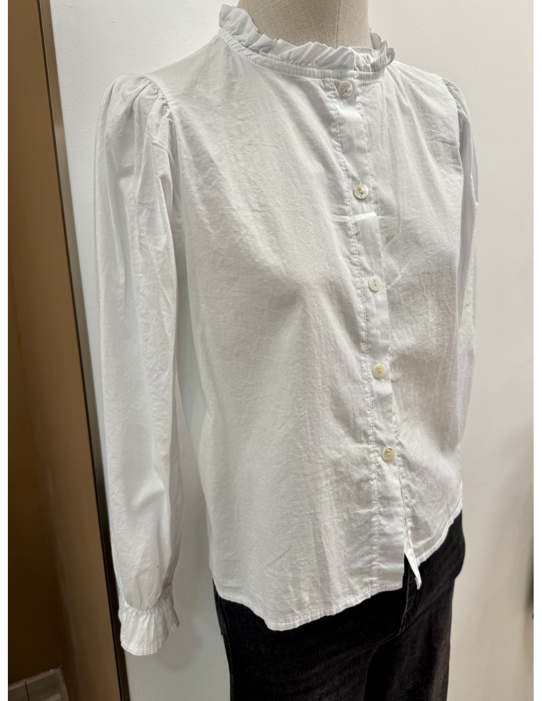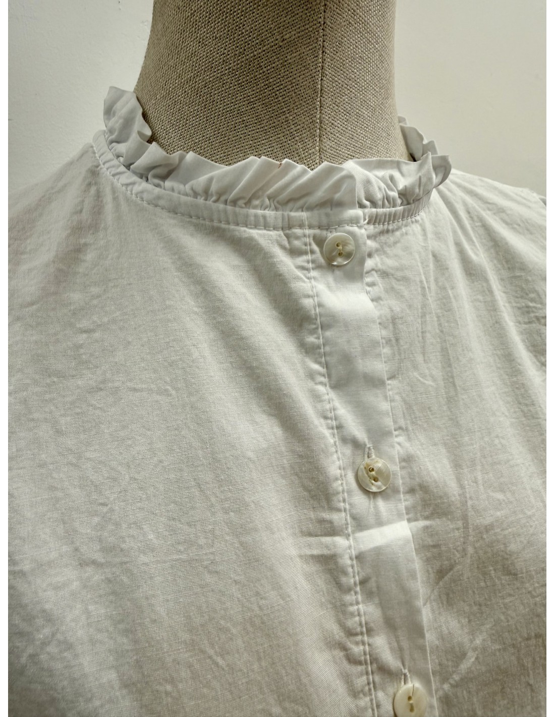 Blusa 100% Algodón, escote con cuello caja y volante en cuello y manga. Cierre mediante botones.