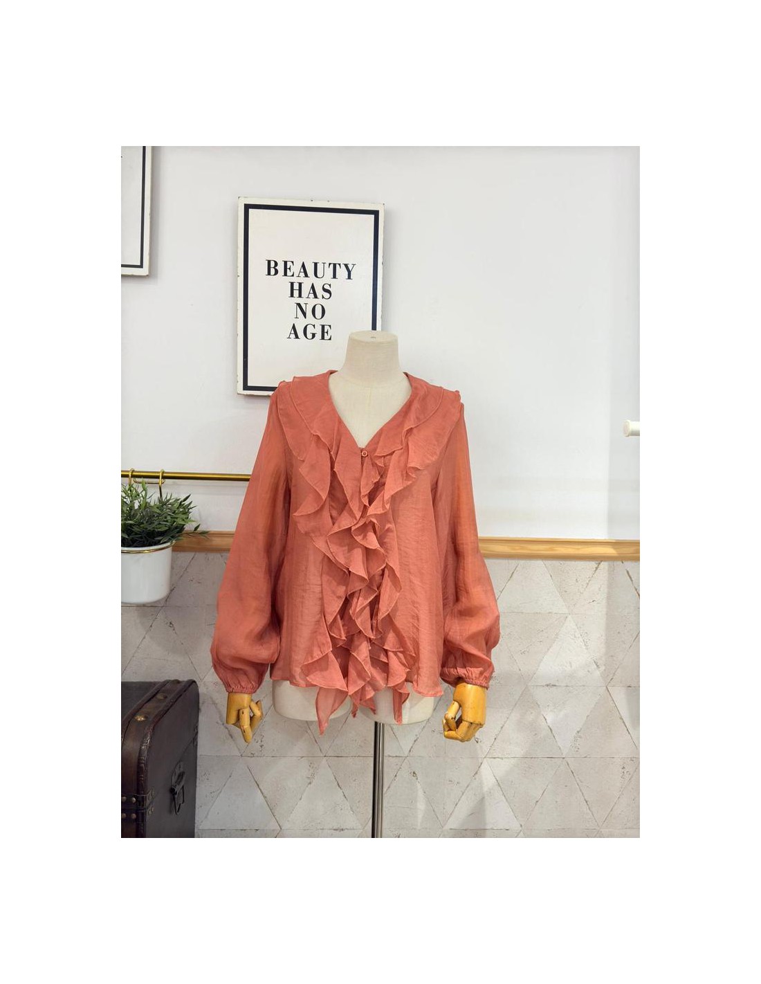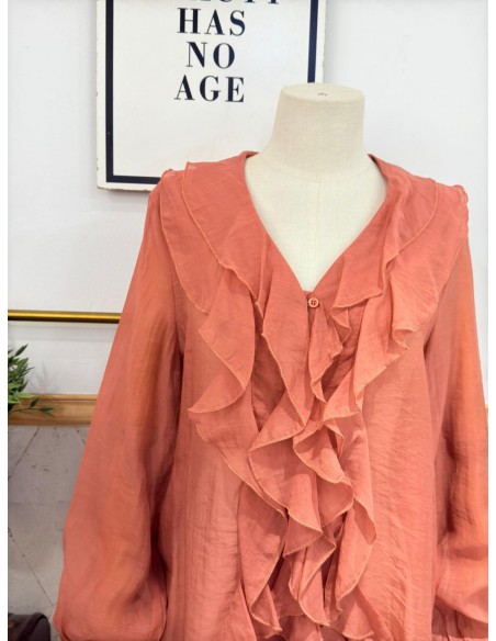 Blusa con escote pico, volantes en pecho y cierre mediante botones a contraste, tejido fino y suave, corte recto, talla normal, no es una blusa entallada. 85% Tencel, 15% Poliamida.