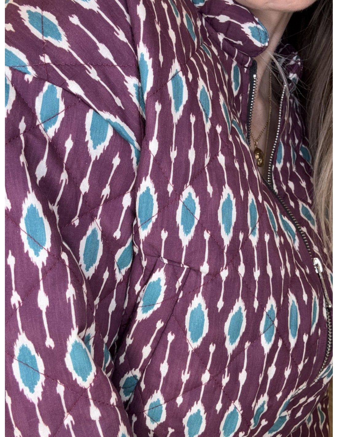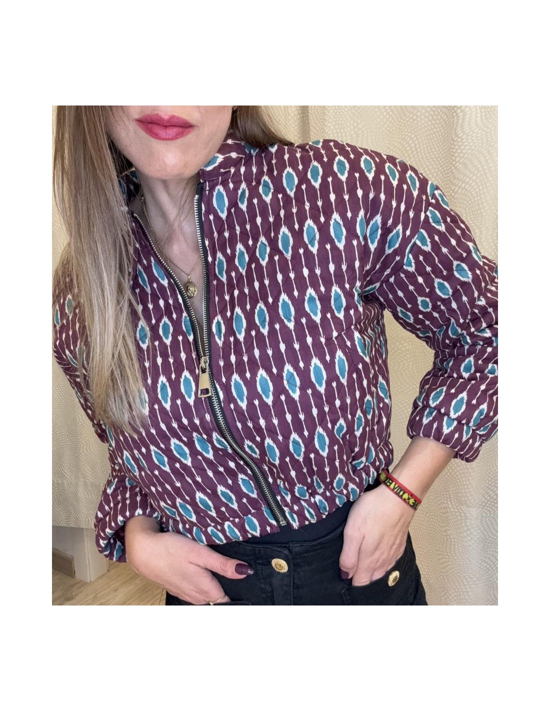 Chaqueta corta tipo bomber estampada, cierre mediante cremallera central, bolsillos laterales, talla única, abarca desde una talla 34 a una 38. Exterior: 100% Algodón, interior: 100% Poliéster.