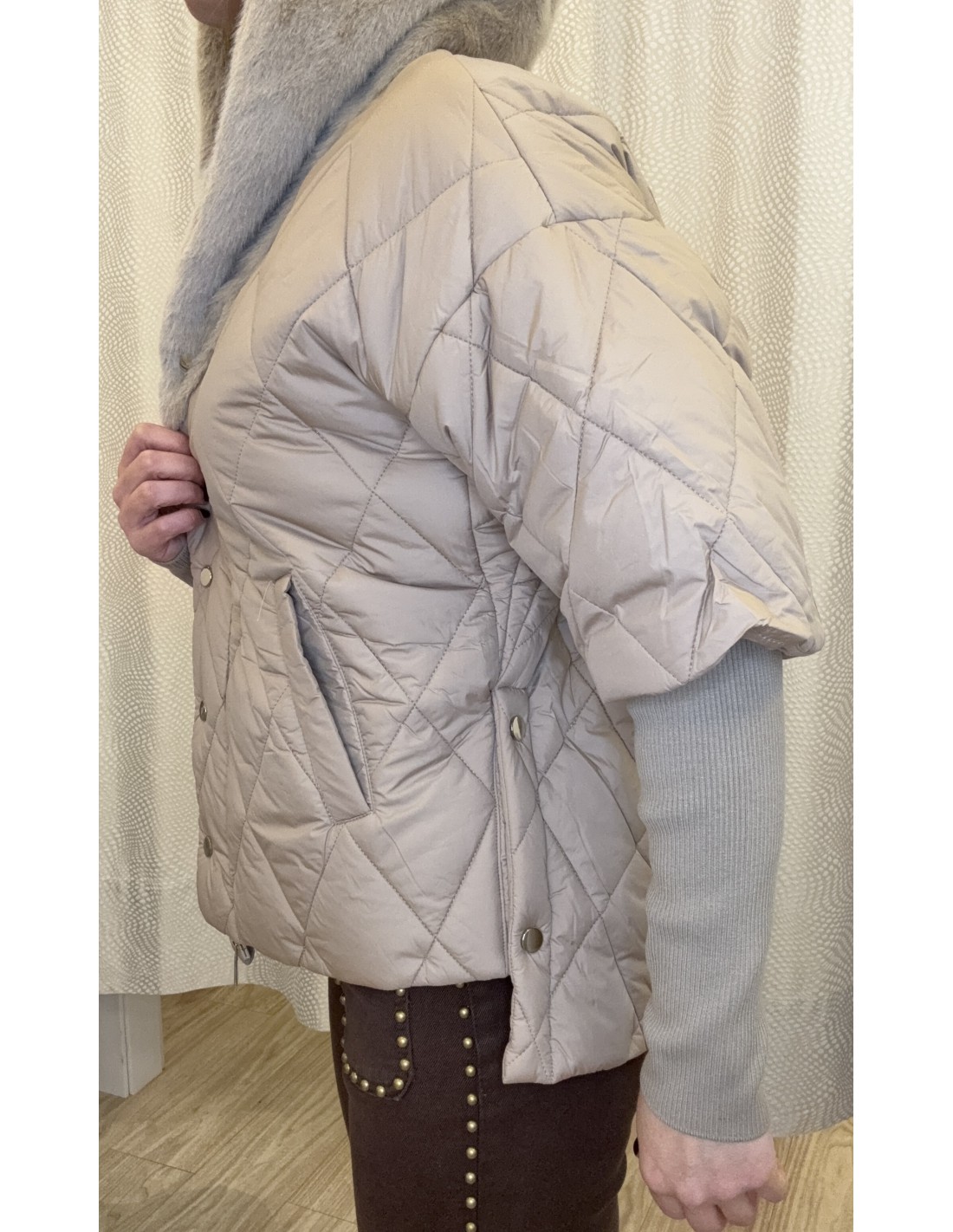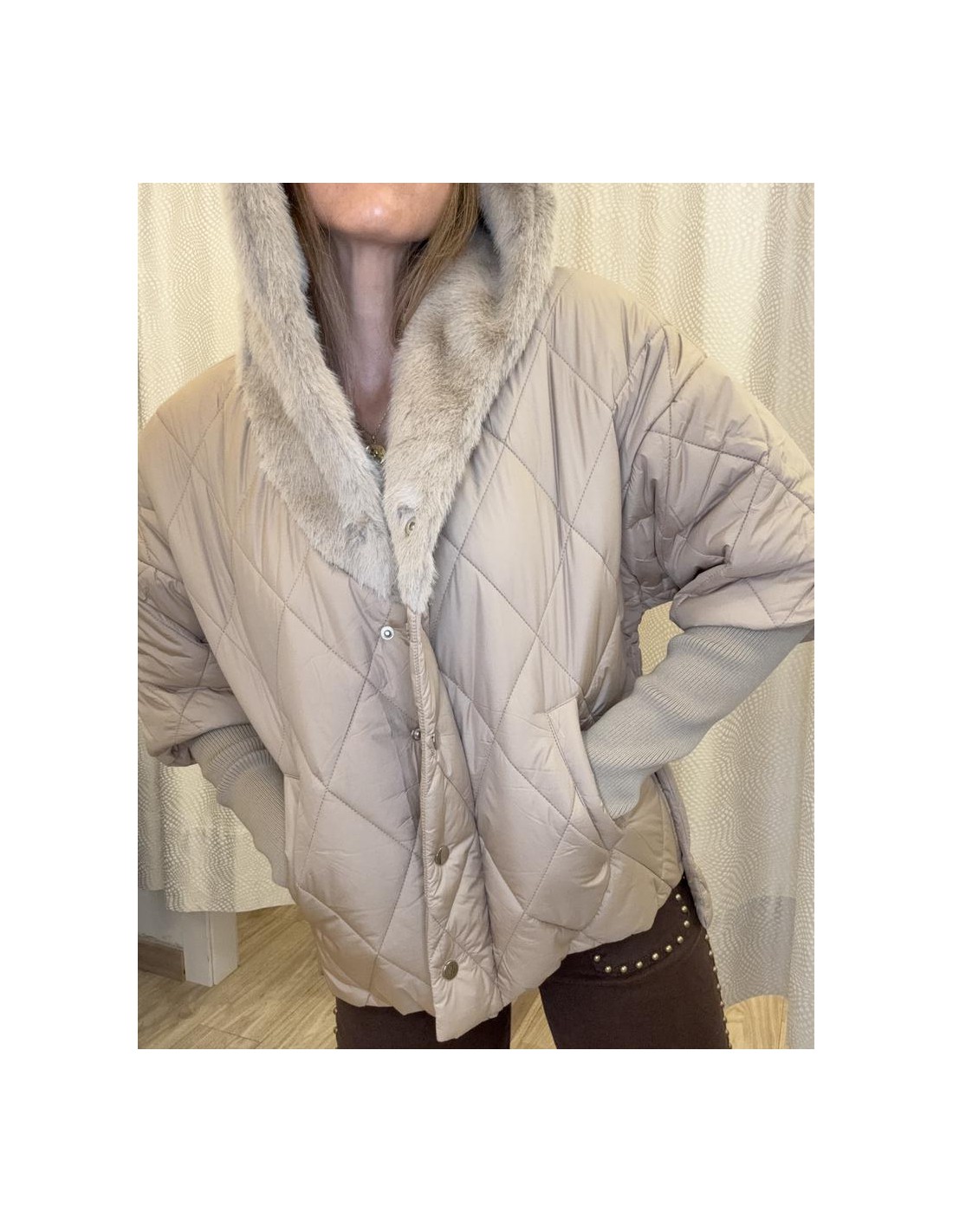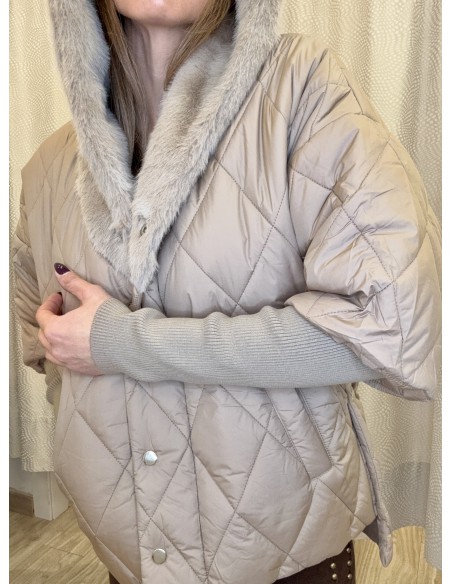 Abrigo con unos detalles preciosos, gorro en pelo, tanto interior como exterior, mangas en punto súper gustosas, corte mas largo en espalda, botones laterales para abertura, bolsillos laterales en la parte enguatada, cierre mediante cremallera y tapeta.