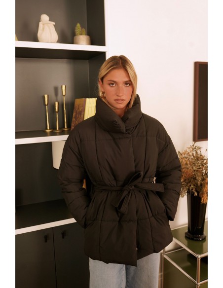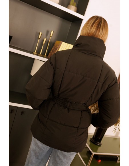 Abrigo tres cuartos, tapa el culete, de gran calidad, muy acolchado, color marrón intenso, maxi cuello, trabillas con cinturón a juego, cierre mediante cremallera central con tapeta y botones tipo clip en dorado.bolsillos laterales, repele en agua.
