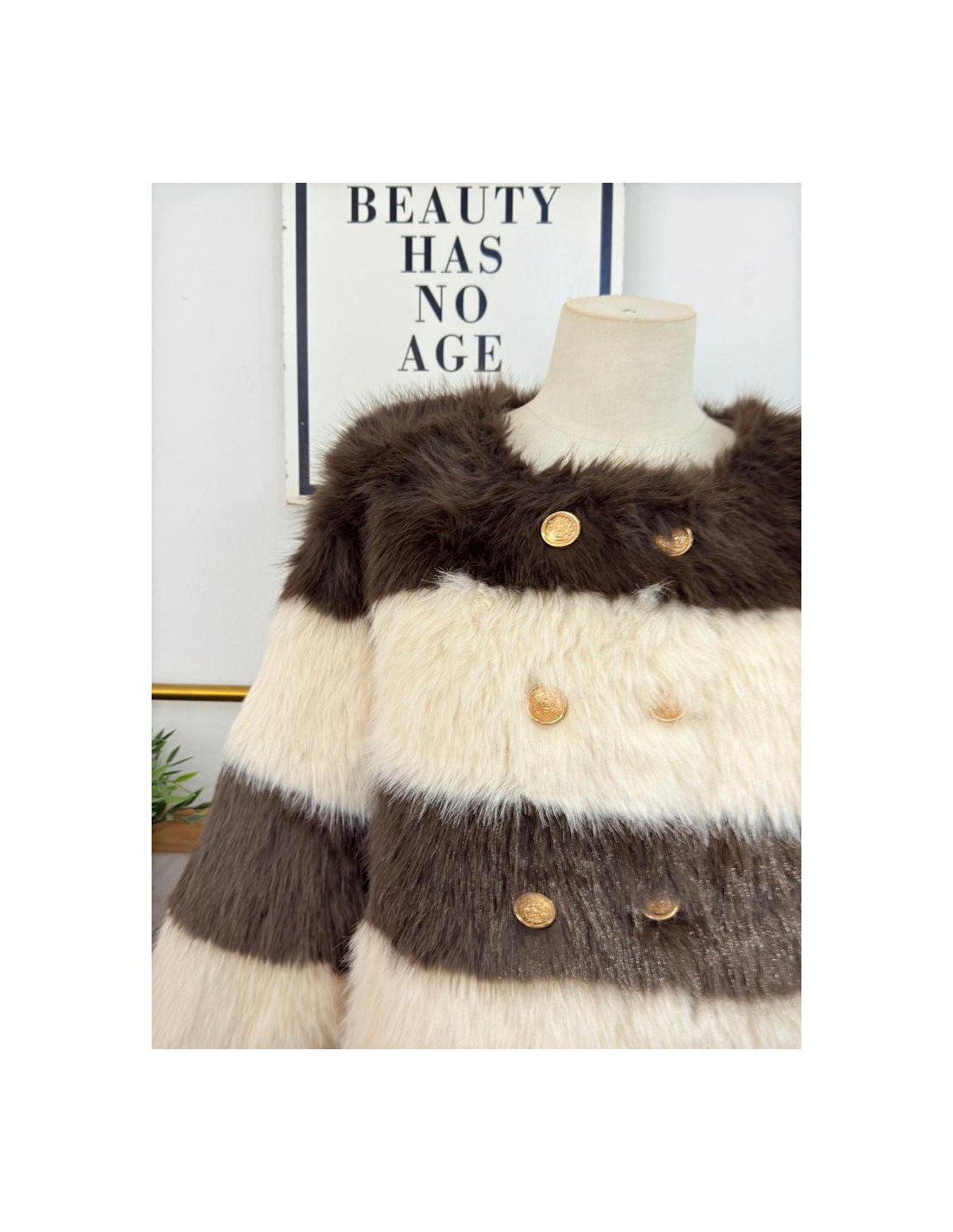 Chaqueta pelo en tono beige y marrón con detalle de botones dorados, bolsillos laterales. Forro interior. 13% Poliéster, 66% Poliamida, 21% Acrílico. TALLAJE S/M- S Ó M/L-L