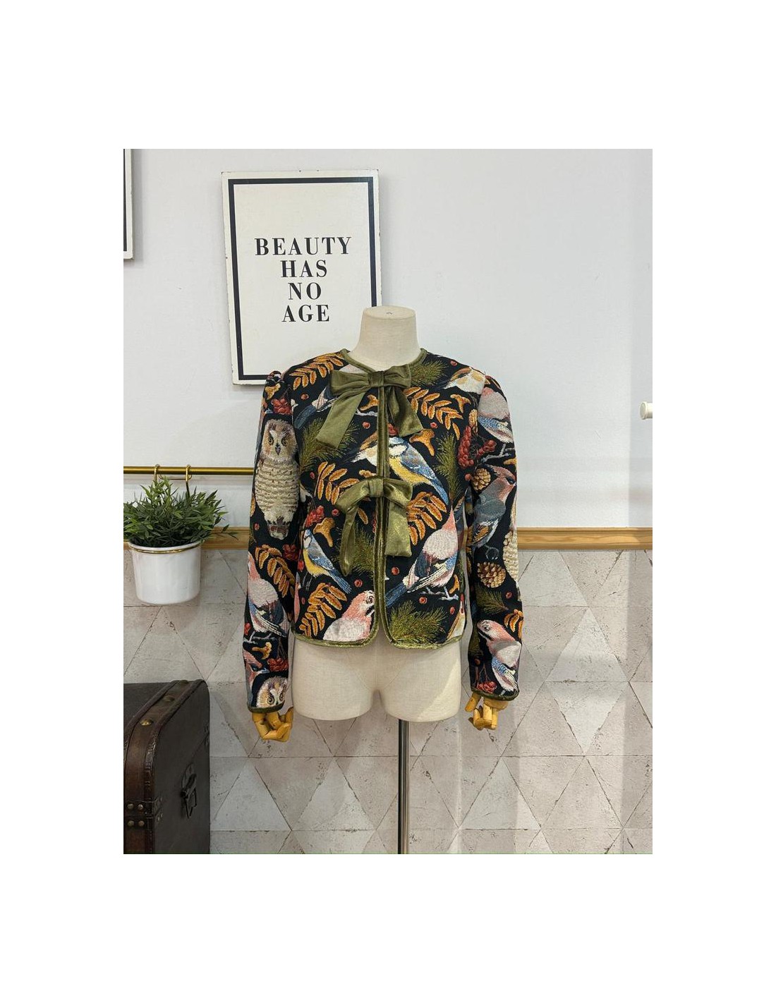 Chaqueta corta con forro interior, cierre mediante corchetes, detalles en filos de terciopelo a contraste con lazadas en pecho. 100% Poliéster. El complemento ideal para cualquier look.