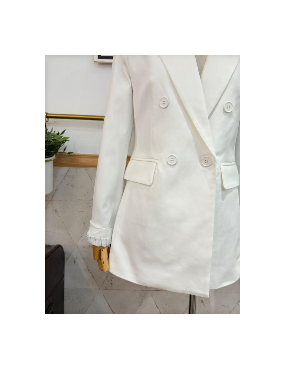 Americana con corte cruzado, interior con forro a rayas. Talla normal. Corte larga.