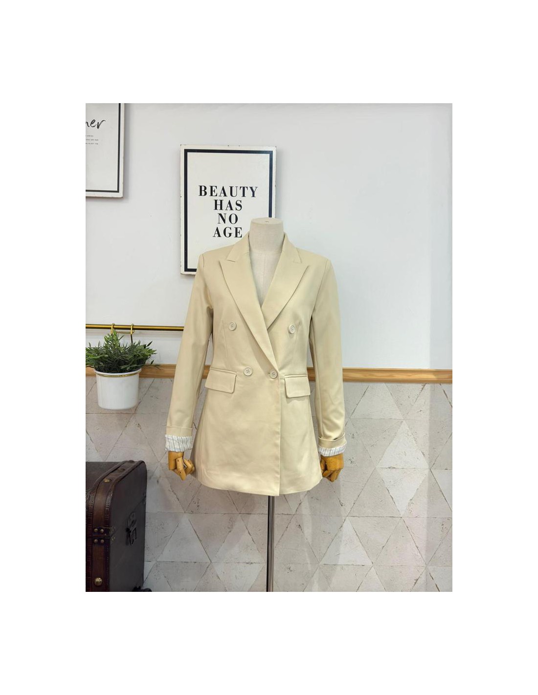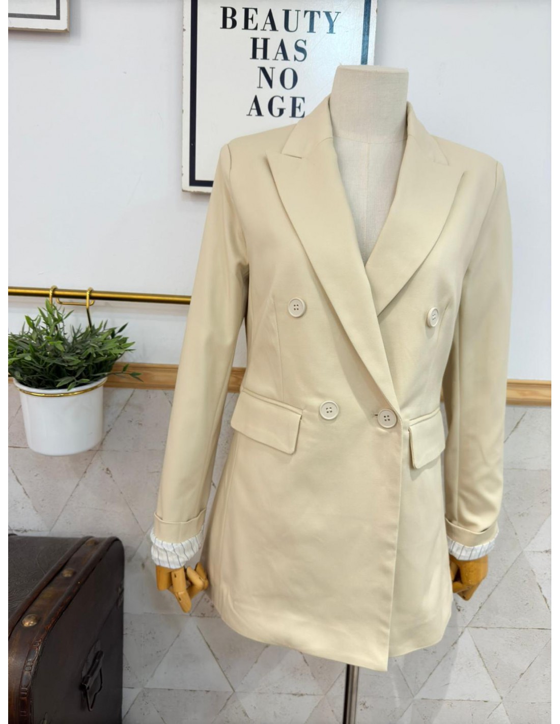 Americana con corte cruzado, interior con forro a rayas. Talla normal. Corte larga.