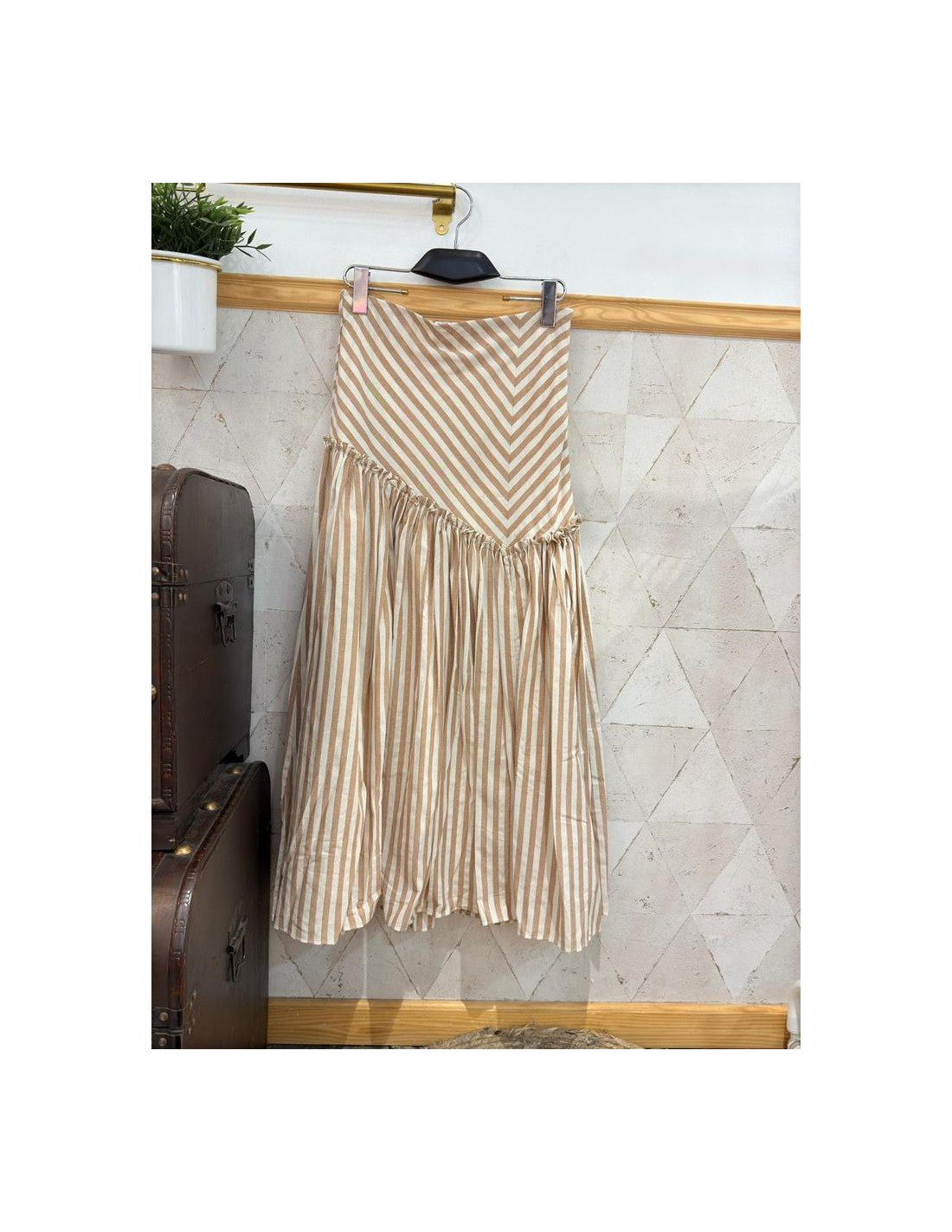 Falda corte midi, volante en cadera, cintura con cierre mediante cremallera invisible, zona elástica en la parte posterior de la cintura. 100% Algodón, forro interior. Talla normal.
