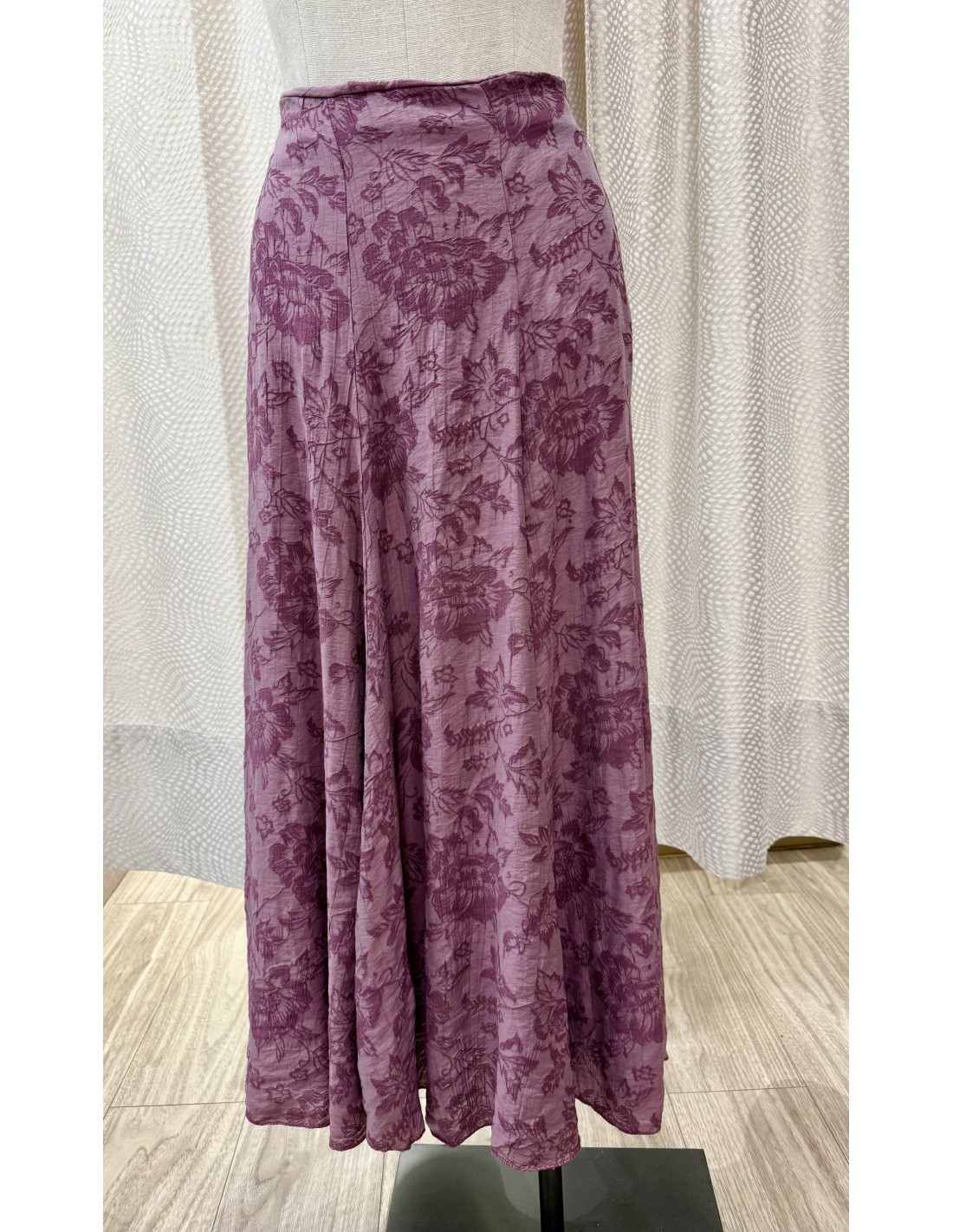 Falda con detalle de tejido jacquard en relieve. Estampado floral. Talla única, abarca desde una 34/36 a una 40/42. 85% Viscosa, 15% Nylon. Cintura elástica en la parte posterior.