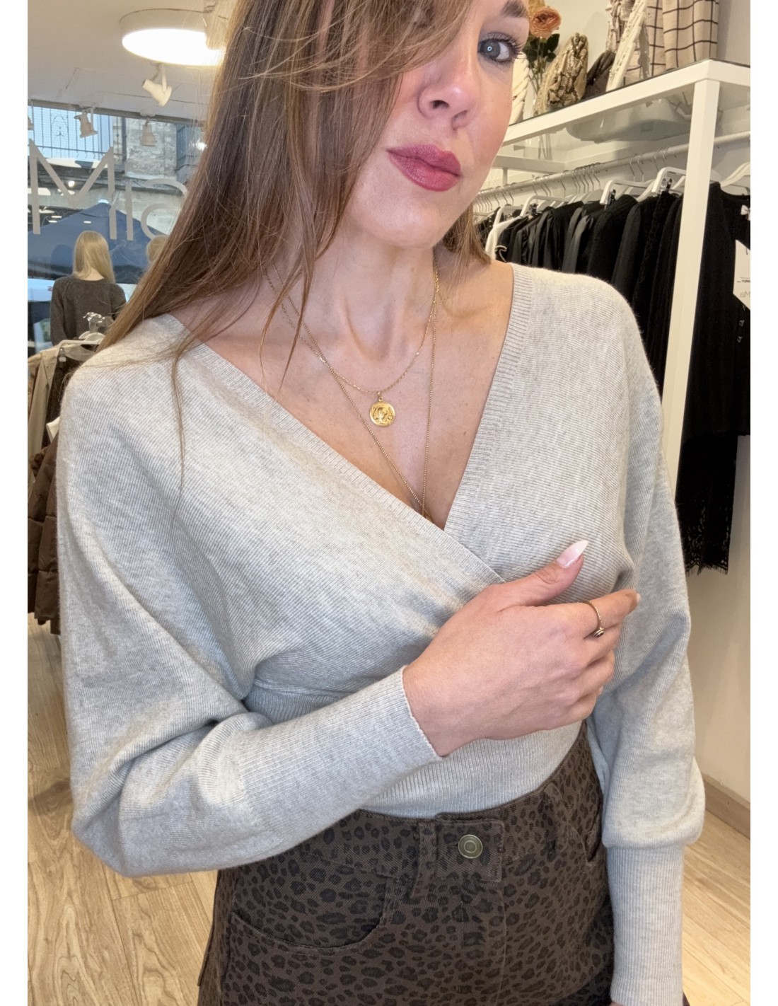 Jersey en marga murciélago, escote pico en pecho y espalda, cintura ceñida. Talla única, abarca desde una 34/36 a una 40.