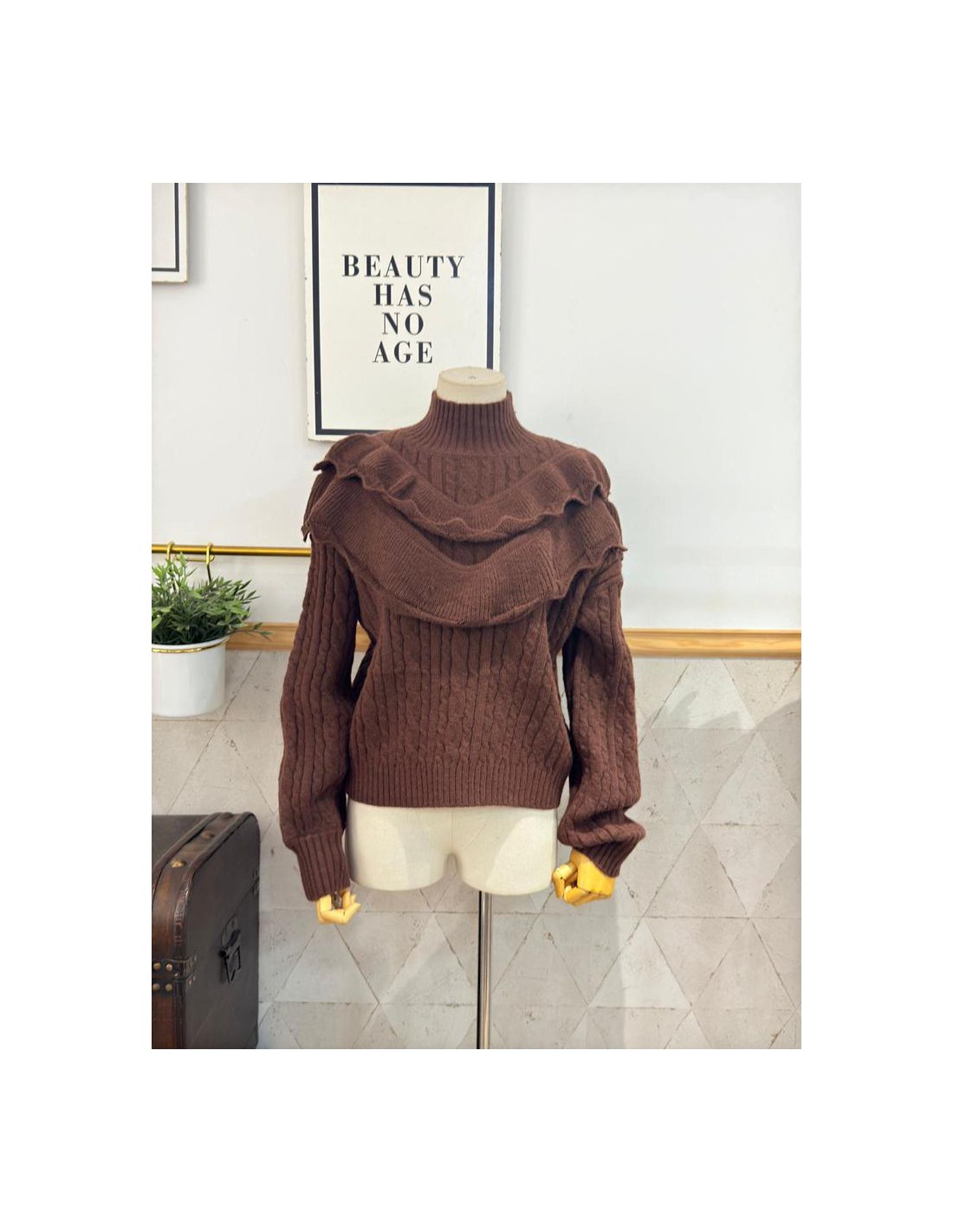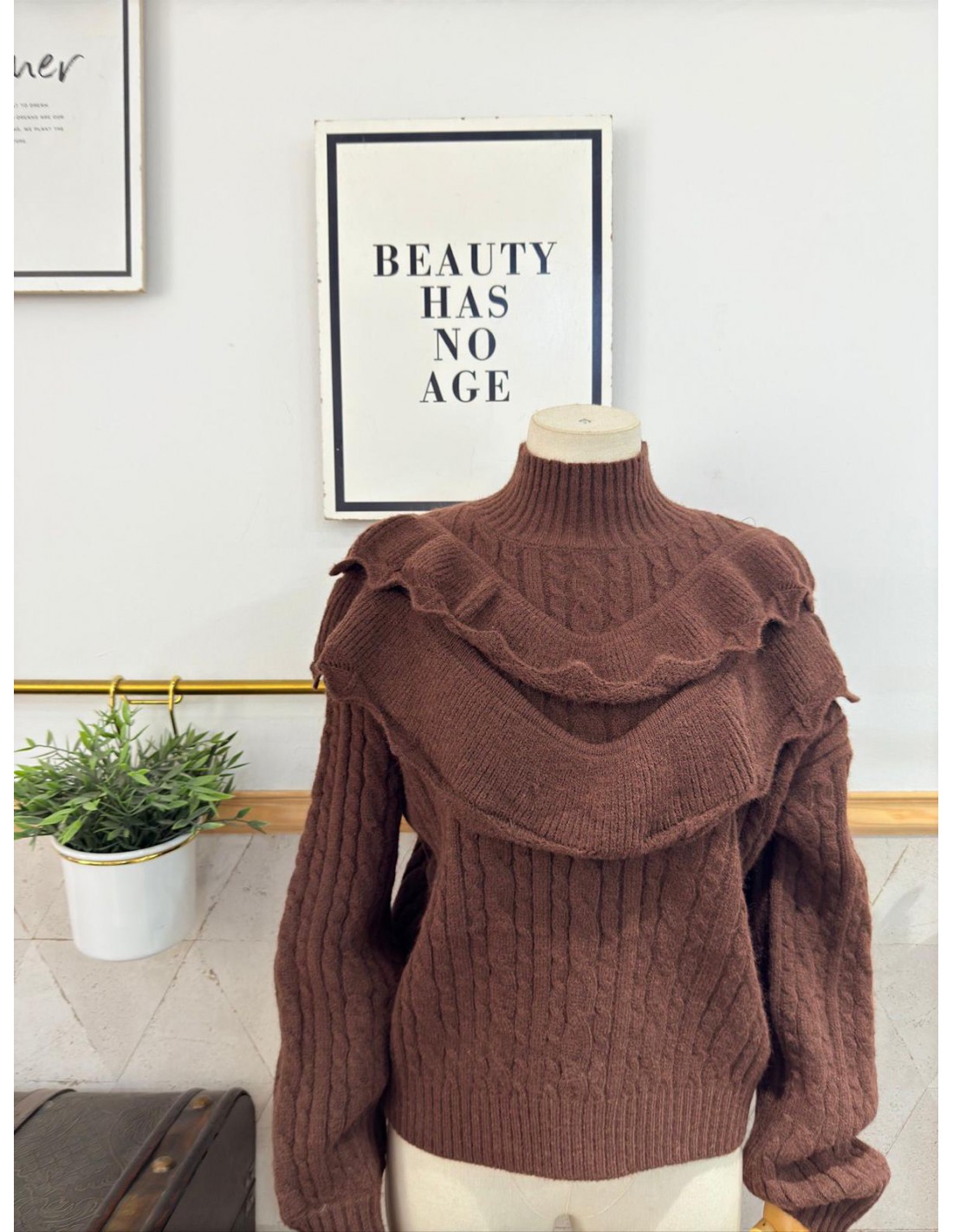 Jersey con cuello subido, punto grueso, detalle de volantes en pecho, y diseño en nudos. 42% Acrílico, 30% Poliéster, 28% Nylon, 28% Poliamida. Talla única, abarca desde una 34/36 a una 42.