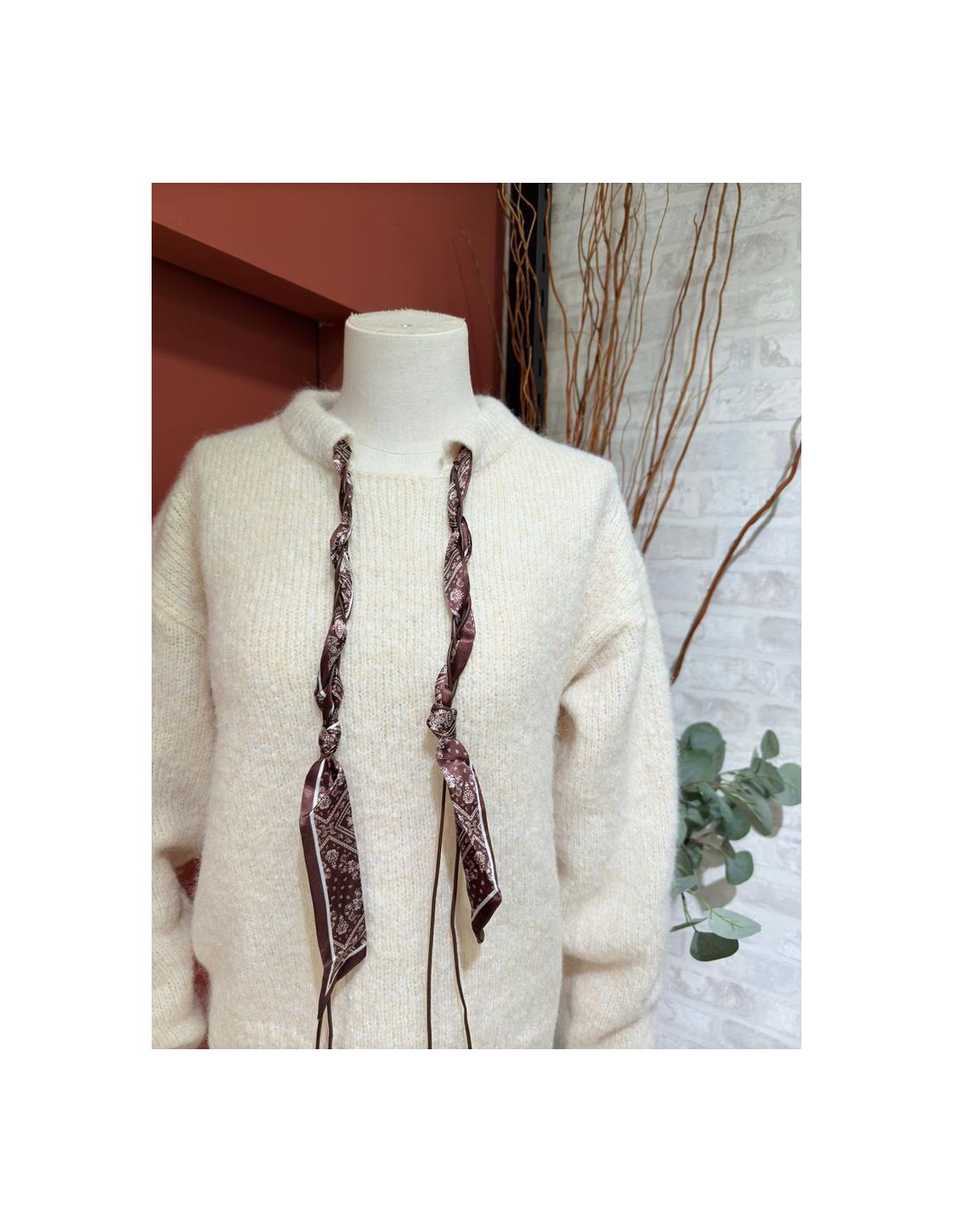 Jersey tacto suave, con detalle de cintas y lazo de seda en cuello. Talla única, abarca desde una 34/36 a una 42/44. 9% Lana, 19% Viscosa, 32% Poliamida, 40% Poliéster.