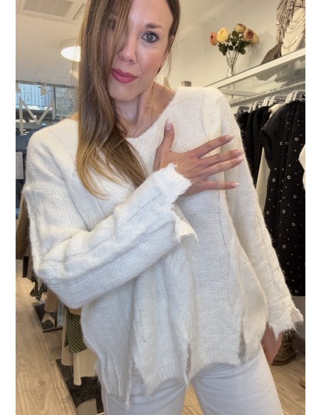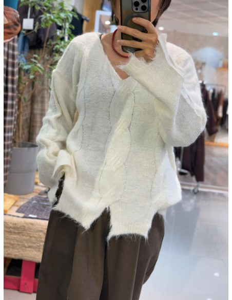 Jersey cuello pico, detalle de rombos en cenefas, bajos de puños y bajo con efecto roto. Talla única, abarca desde una 36 a una 42/44. 72% Acrílico, 15% Poliamida, 8% Lana, 5% Elastano.