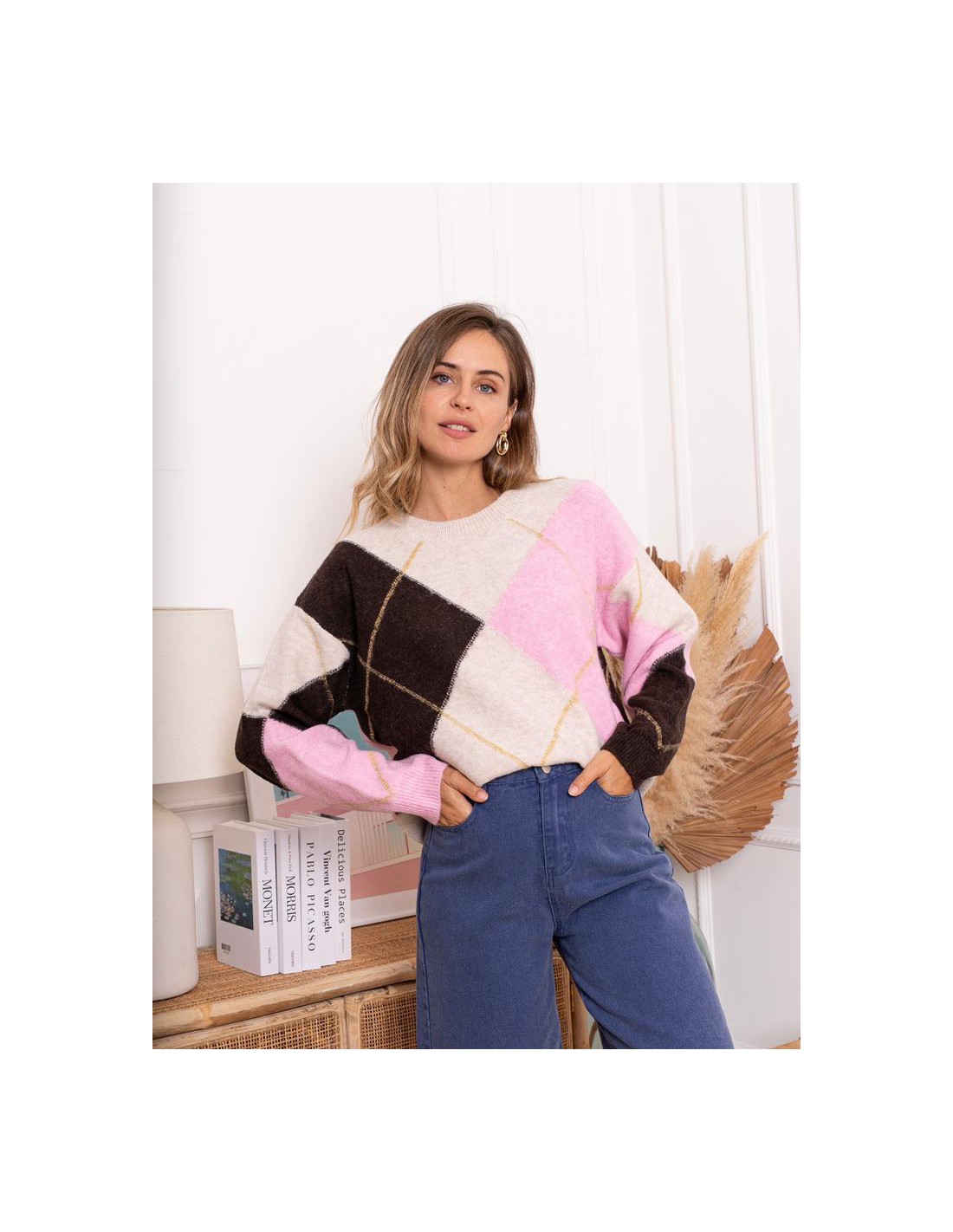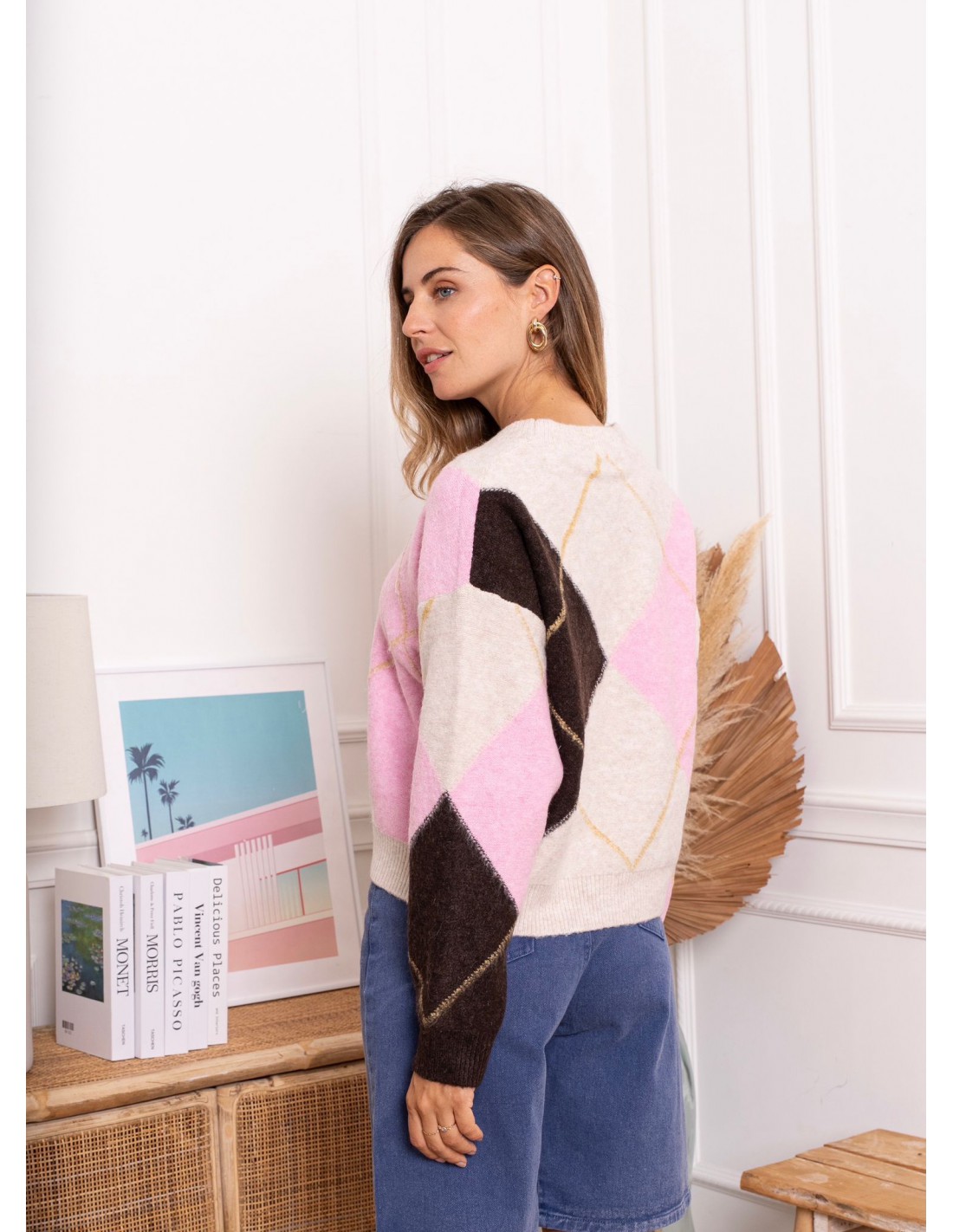 Jersey talla única, corte amplio, detalle de rombos a contraste, cuello caja.