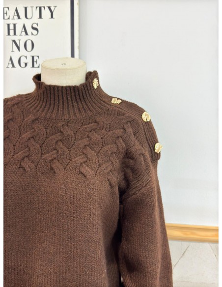 Jersey cuello perkins con detalle de botones dorados en hombro, talla única, abarca desde una 34/36 a una 42/44. 65% Poliéster, 28% poliamida, 6% Lana.