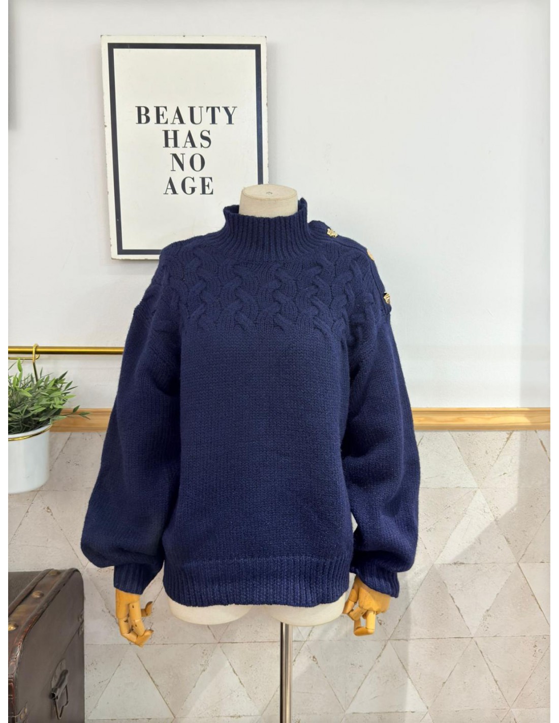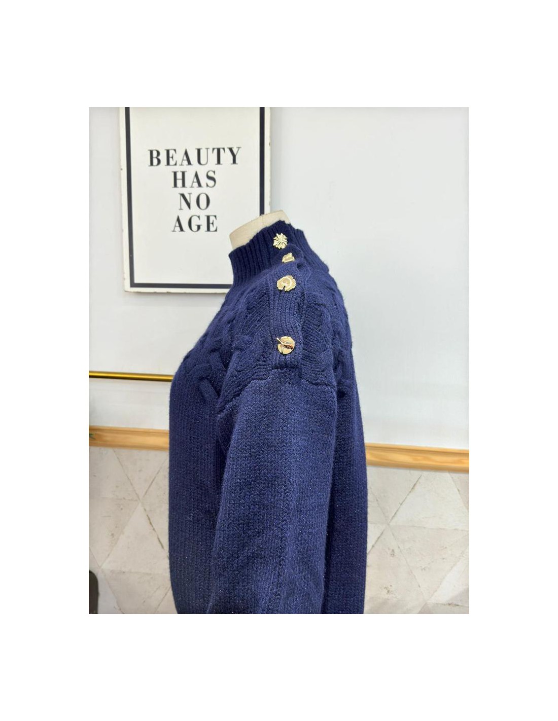Jersey cuello perkins con detalle de botones dorados en hombro, talla única, abarca desde una 34/36 a una 42/44.