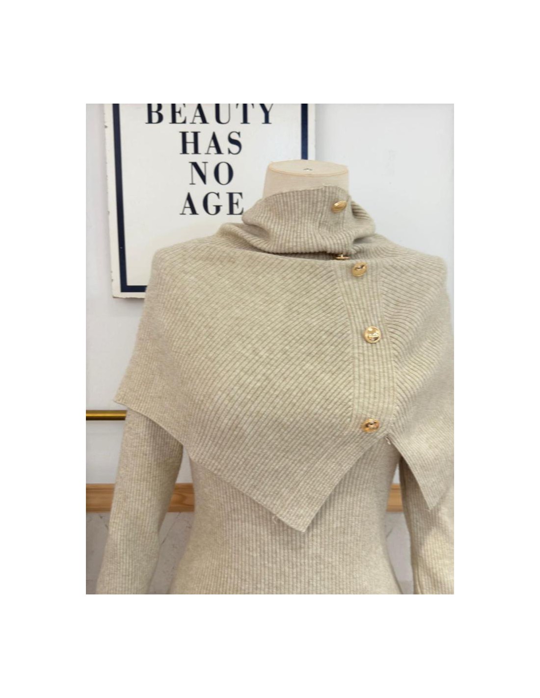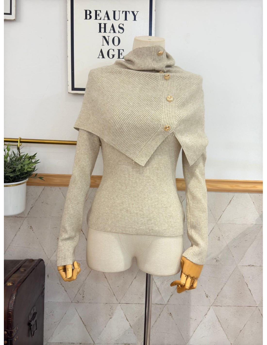 Jersey en canalé con el cuello redondo abierto. detalle de cuello superpuesto con botones dorados. Talla única, abarca desde una 34/36 a una 40/42. 60% Poliéster, 35% Algodón, 5% Elastano.