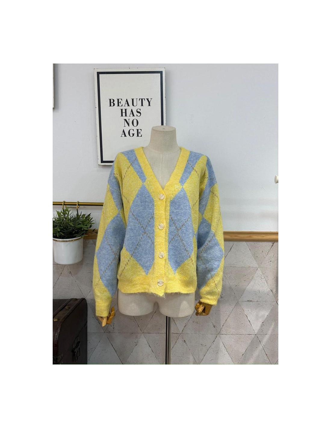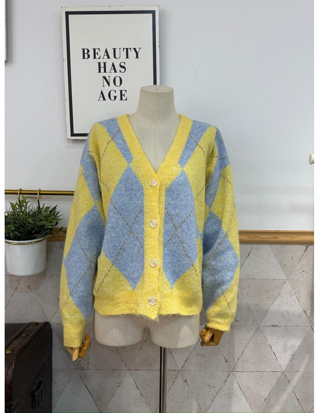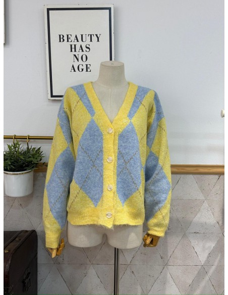 Rebeca/chaqueta en rombos con escote pico y tendencia absoluta. Talla única, abarca desde una 34/36 a una 42/44. 49% Poliéster, 20% Poliamida, 20% Acrílico, 8% Lana, 3% Elastano.