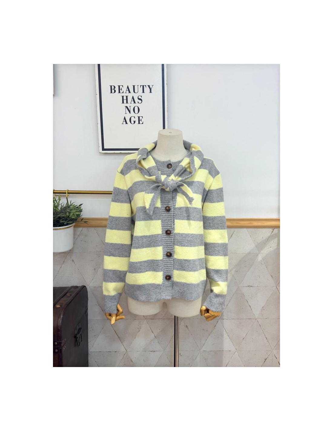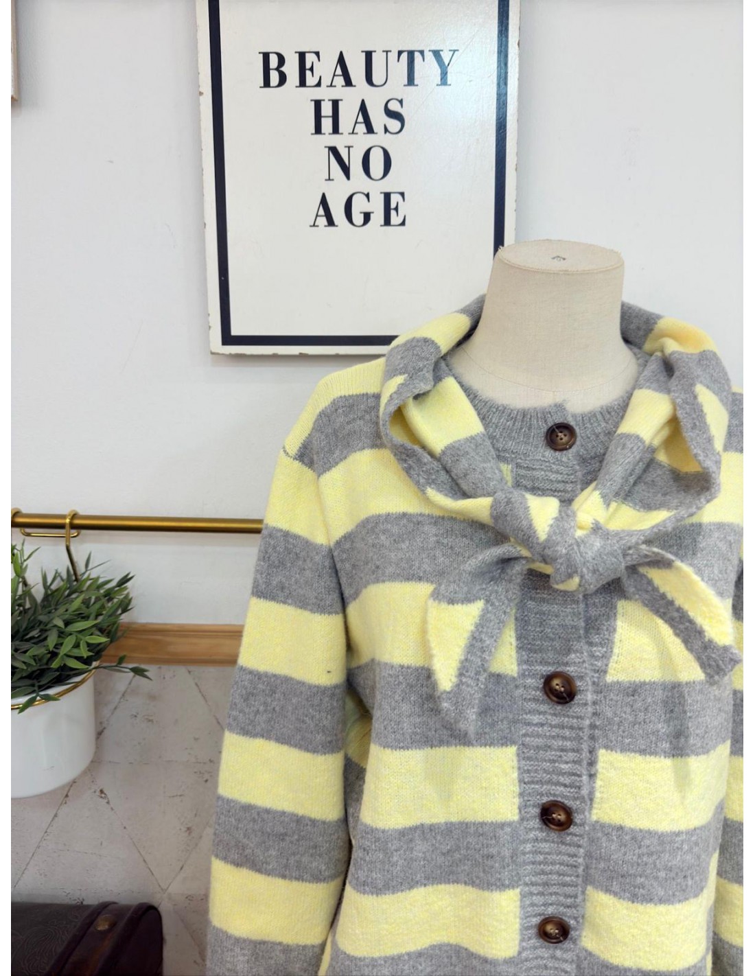 Chaqueta en punto, con detalle de mini bufanda a juego e incluida. Talla única, abarca desde una 34/36 a una 42/44. 65% Poliéster, 29% Acrílico, 6% Lana.