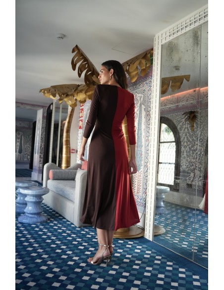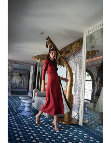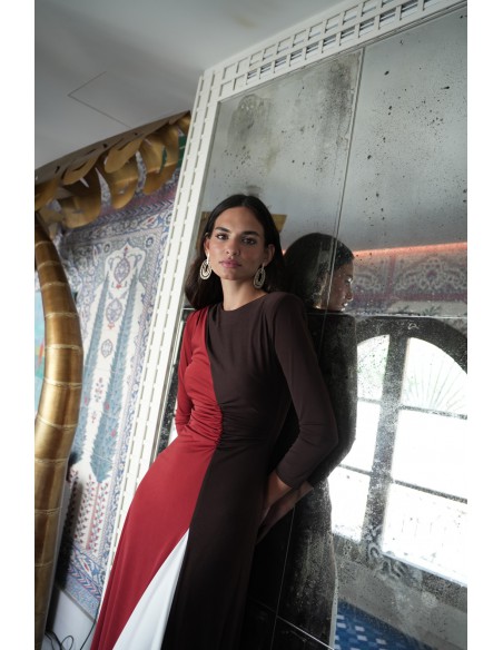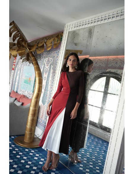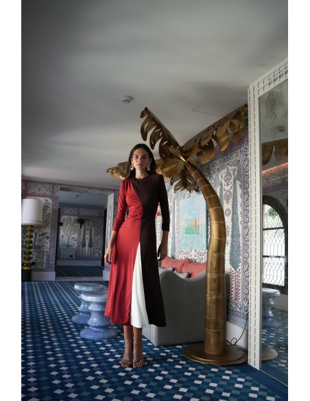 Vestido tricolor confeccionado en punto de seda. Cortes verticales combinando colores. Detalle de frunce en hombro con hombreras interiores. Cremallera invisible en espalda y forro interior.