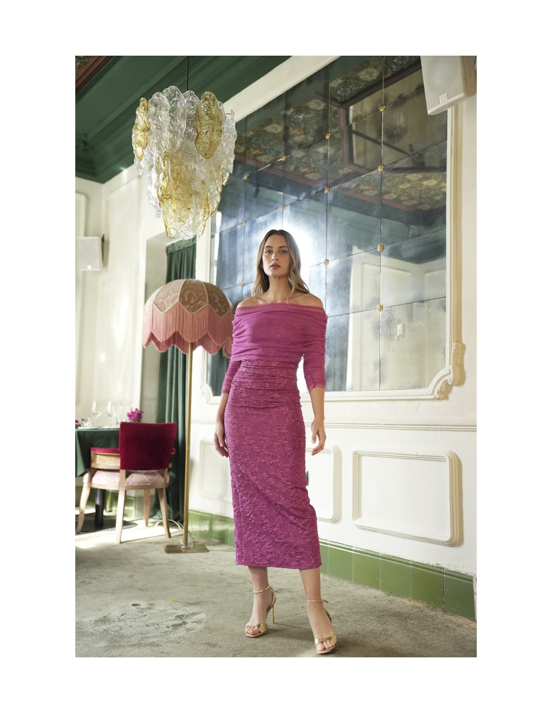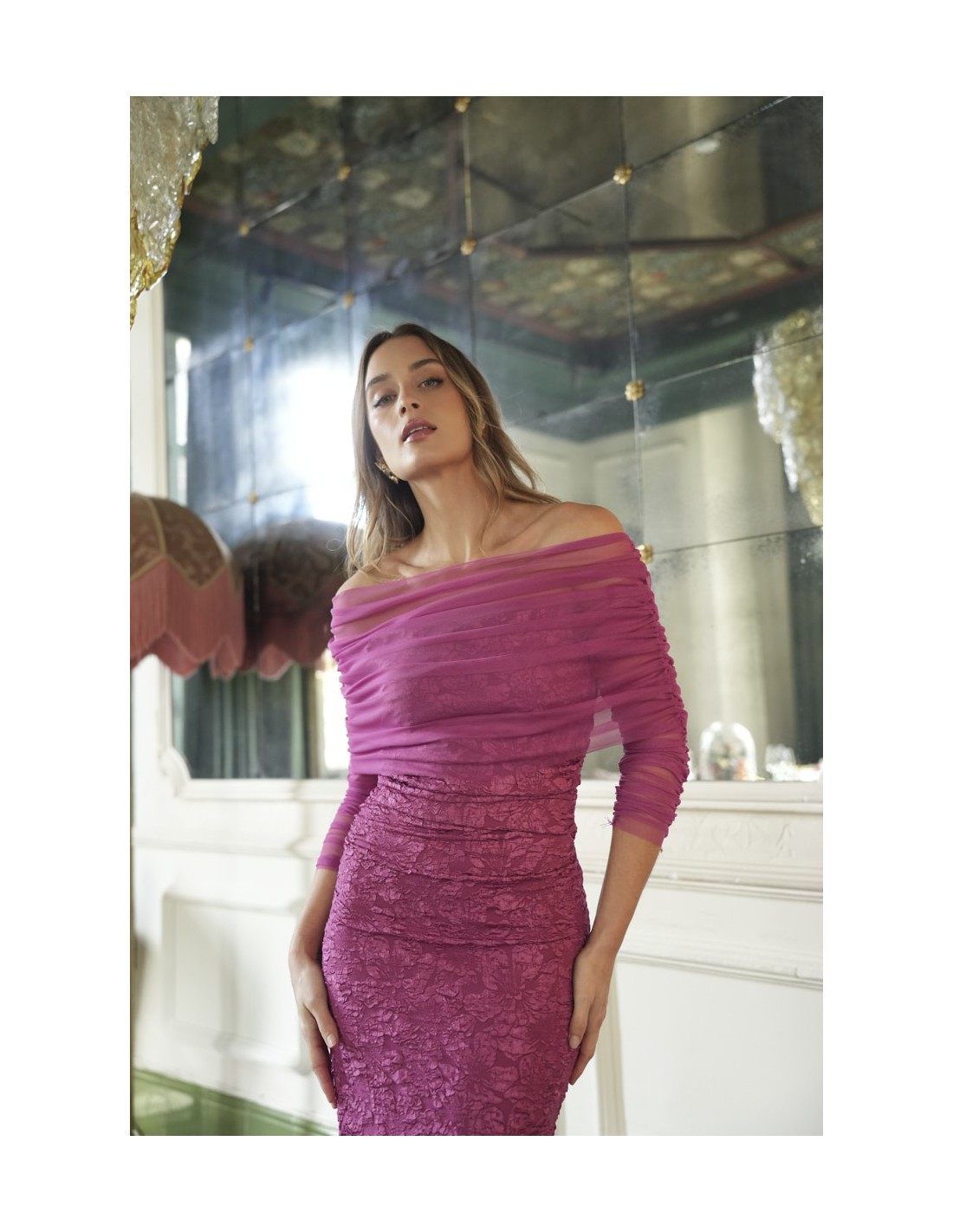 El Vestido Rosalía es un vestido de invitada confeccionado en tejido jacquard con tul, que destaca por su escote bañera y largo midi, perfecto para todo tipo de celebraciones. Su drapeado en la cintura realza la silueta con naturalidad, mientras que el forro interno garantiza confort durante toda la jornada.