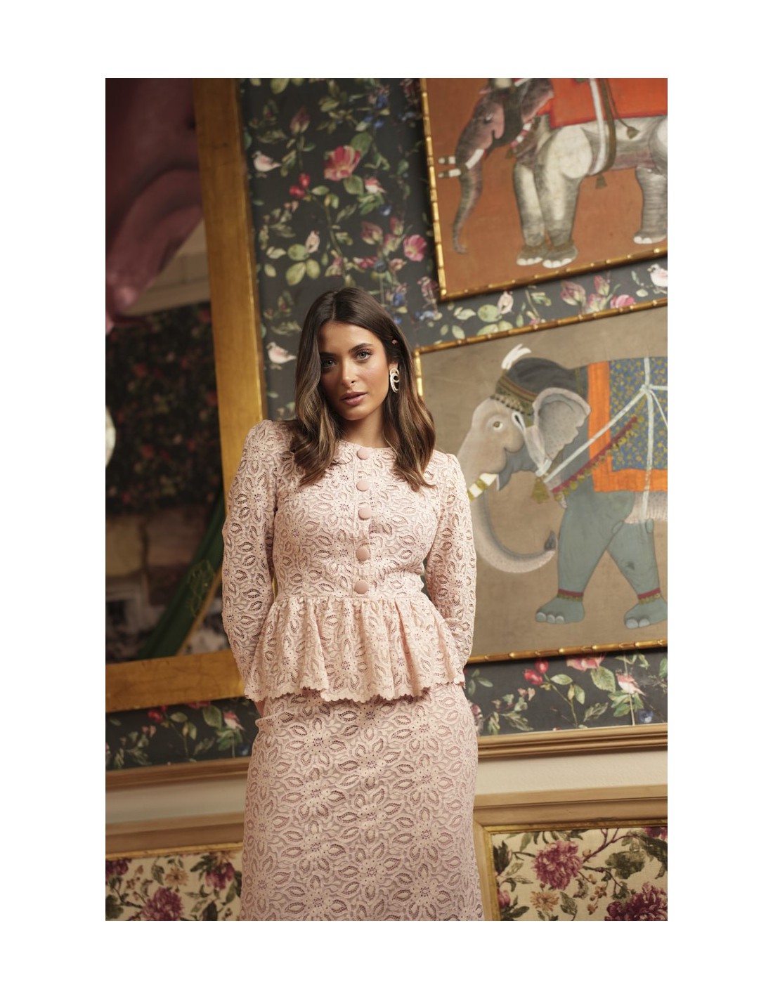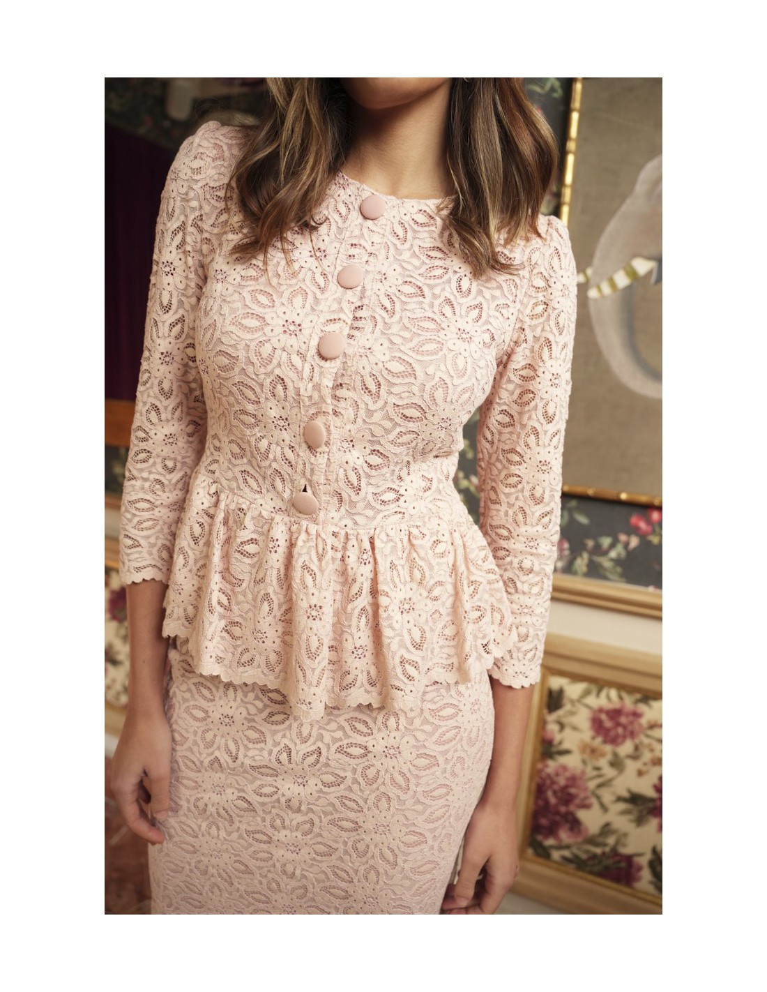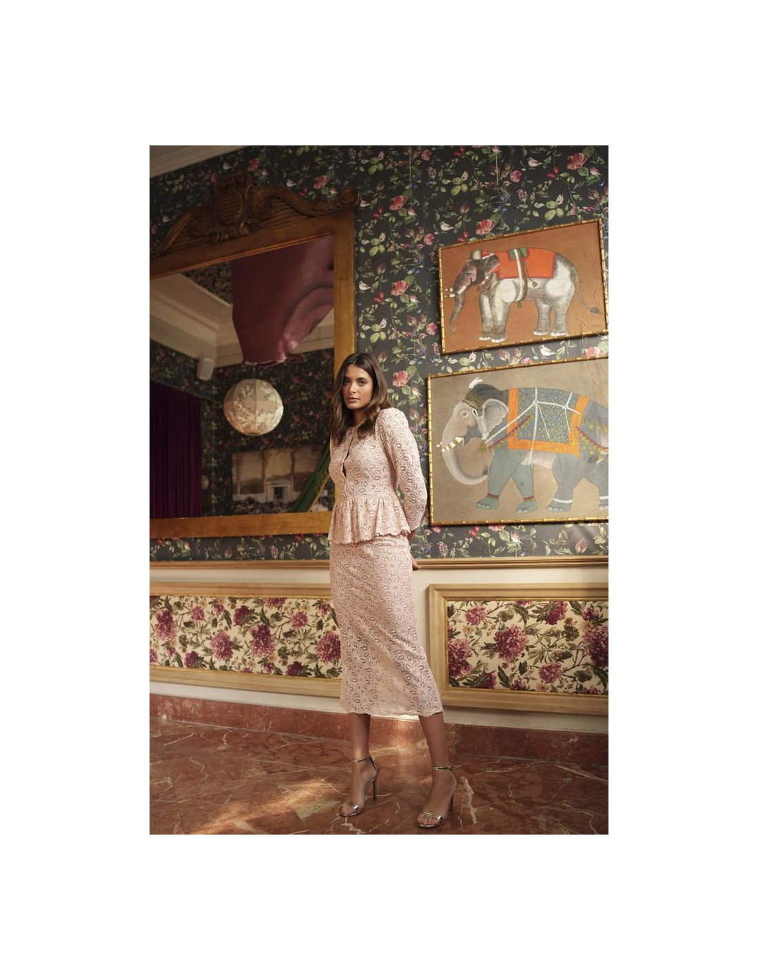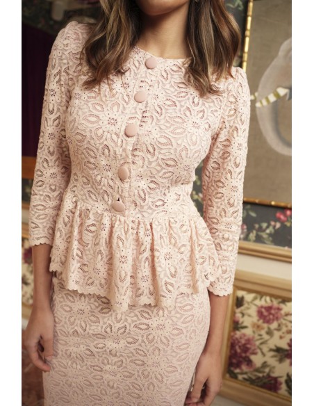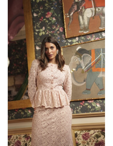 El conjunto Alanis está confeccionado en tejido de macramé, aportando textura y elegancia al diseño. La falda lápiz midi forrada estiliza la silueta, mientras que el top con botones forrados, el volante bajo tipo peplum y la hombrera realzan la figura con un acabado sofisticado. Incluye forro interior para mayor comodidad y una caída impecable.