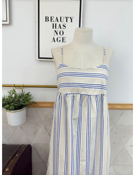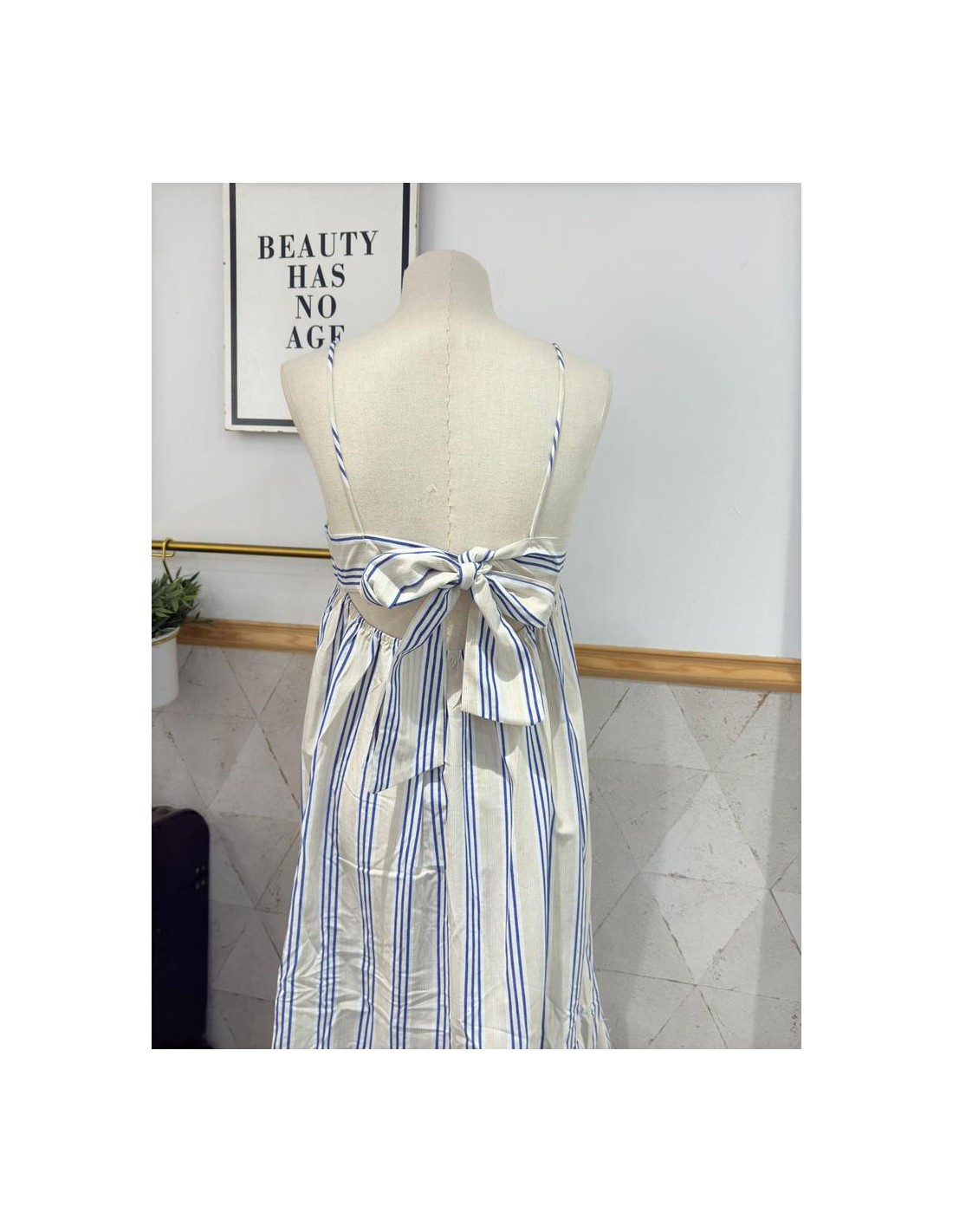 Vestido con tirante fino, corte midi, volantón en bajo, espalda al aire con lazada, tejido en escote con tela doble.