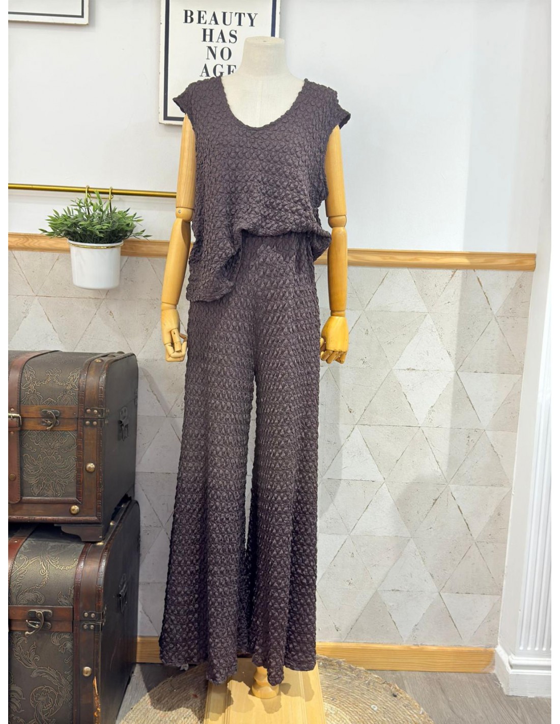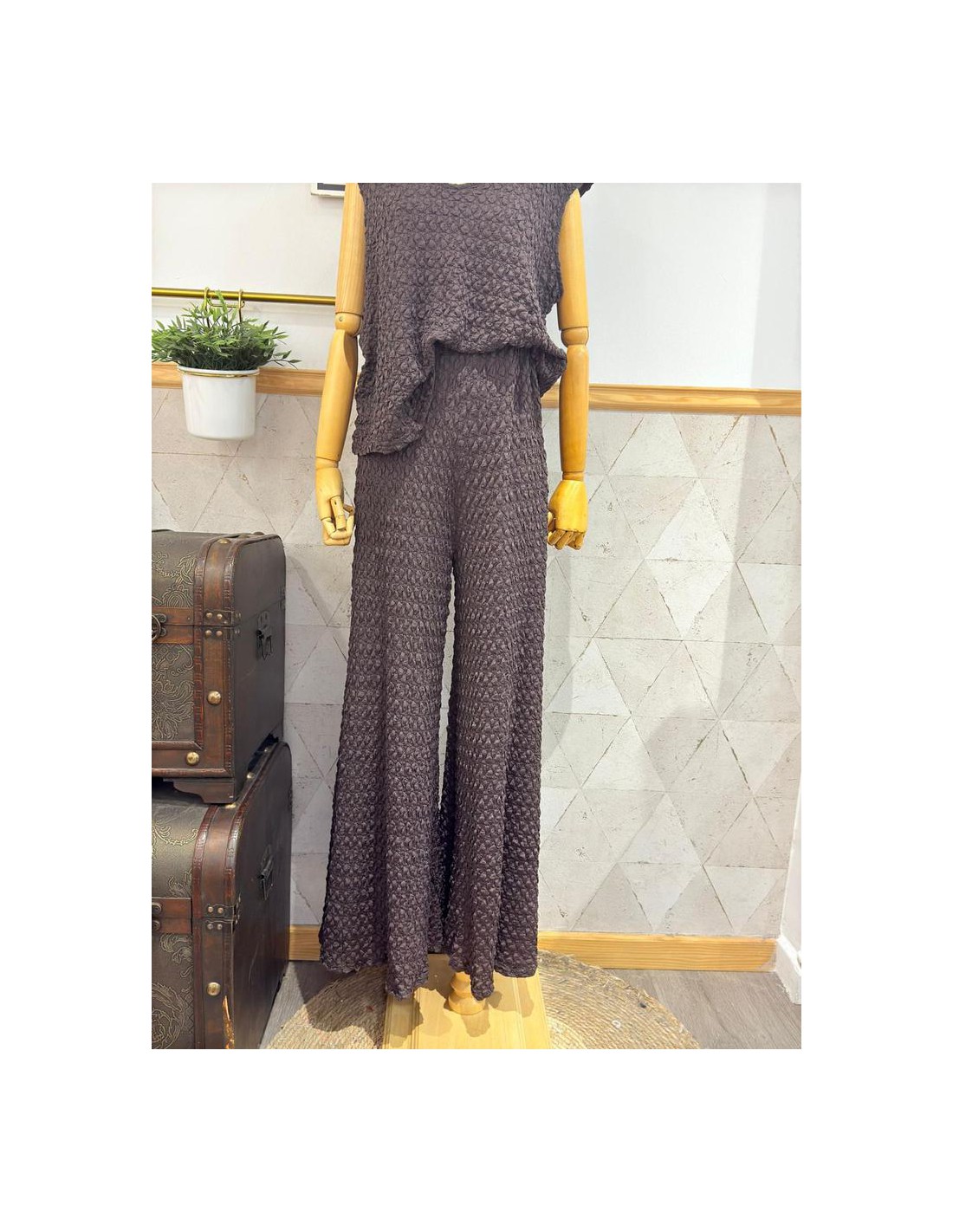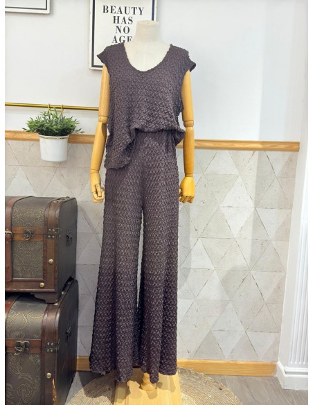 Conjunto de top y pantalón, con tejido suave, sedoso y con muchísima caída. 92% Poliéster, 8% Spandex. Conjunto talla única, abarca desde una 38/40 a una 44/46.
